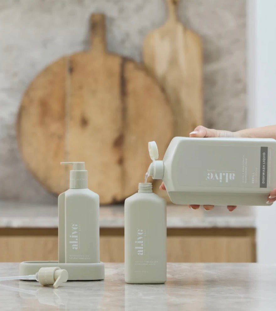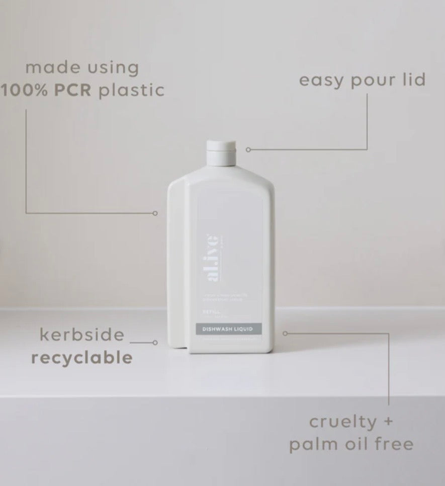 Each refill is designed to refill the 300ml al.ive body Dish Wash bottle over three times. With a controlled-flow spout for mess-free pouring, compact shape for easy storage, and full kerbside recyclability, it offers a practical, premium solution while extending the life of the product you already love.
