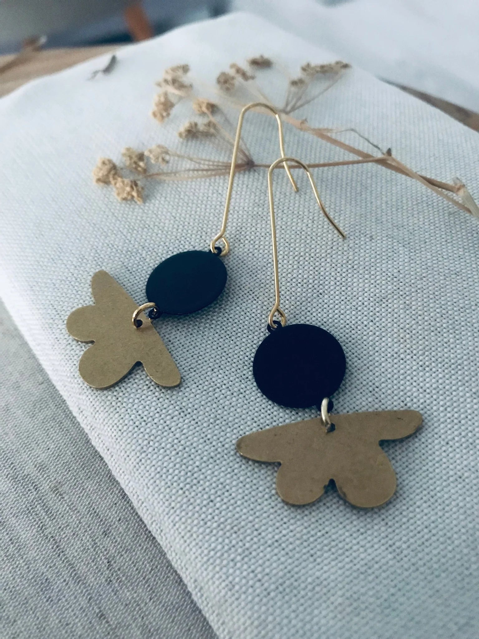 The Agatha drop earring is on a long gold ear wires with black circles and gold flowers