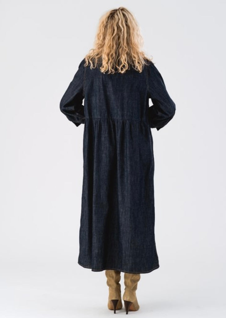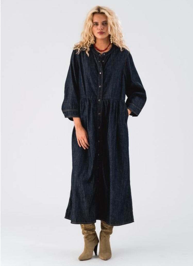 The Aliya Maxi Dress is a timeless addition to any wardrobe, perfect for those who appreciate a classic dark denim dress with a modern twist. The dress is made from 100% cotton, and the classic denim stitching adds authenticity and detail to its simple yet elegant design. It features a round neckline and 3/4 length sleeves with slightly wide cuffs that add a modern touch. The dress has a beautiful fit with a slightly voluminous silhouette and small pleats at the waist, ensuring a flattering shape without appearing heavy. The Aliya Maxi Dress features a button-through front, allowing for versatile styling, and is ideal for both everyday wear and special occasions, as it can easily be dressed up with elegant accessories and heels or toned down with casual shoes for a more relaxed look.