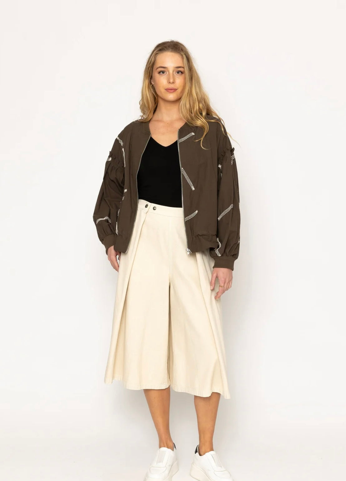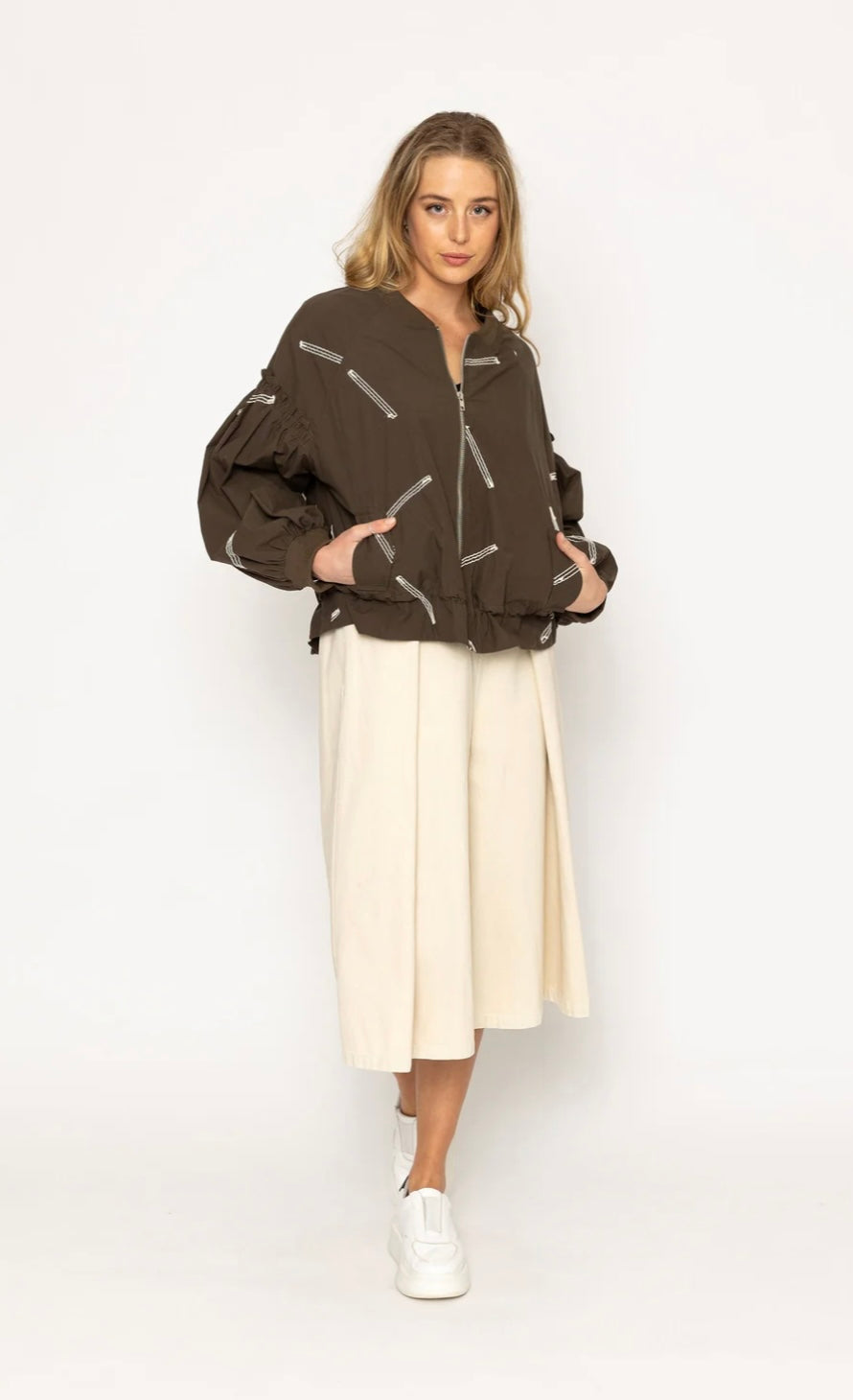 A stunning bomber-style piece that elevates your wardrobe. Adorned with a delicate ruffle at the shoulder seam and ribbed collar and cuffs, this jacket also features a drawcord at the waistline for a customizable fit.