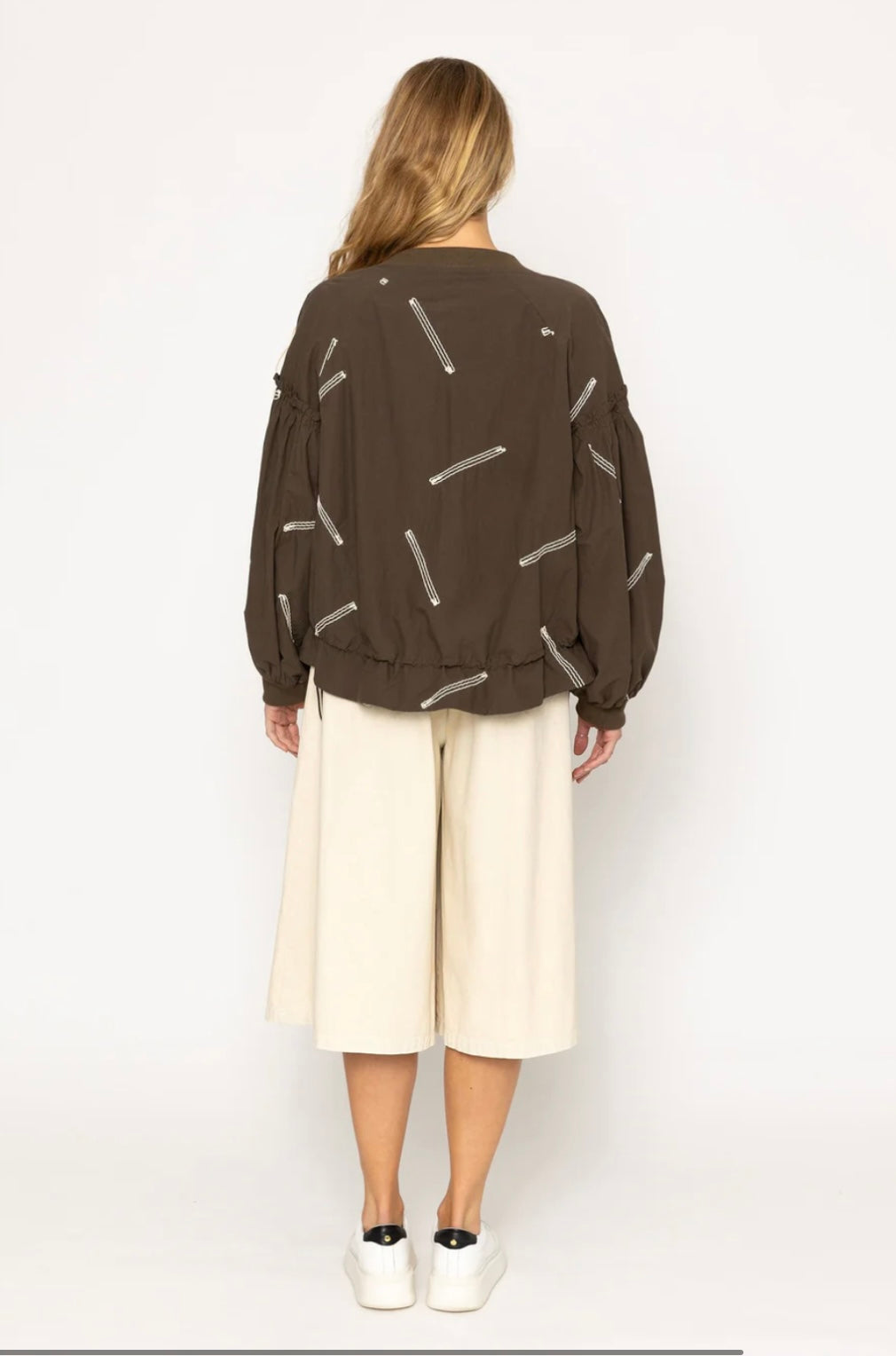 - Subtle puff sleeves, Front pockets, Line pattern print
