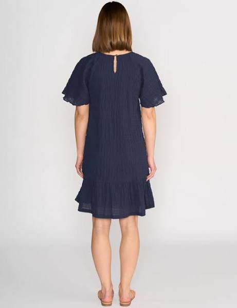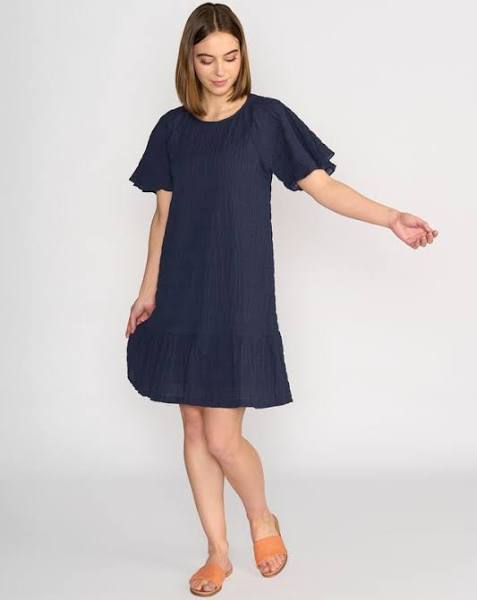 The Eclipse Dress is a short, floaty style made from a lightweight textured fabric with a soft, drapey finish. Raglan sleeves, gathered hem panel, fully lined through the body. An easy Summer outfit.