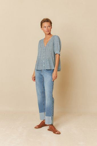 A shirt full of details. It has elastic balloon sleeves, a V-neckline, and waistband with a super feminine silhouette. Woven from a geometric-print cotton chiffon fabric.