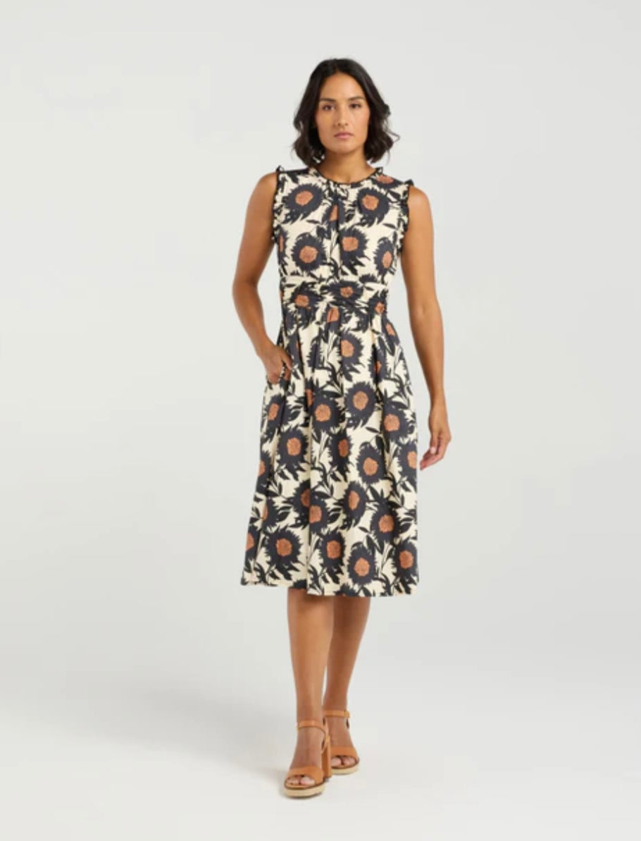 Romantic yet tailored, this sleeveless dress features a beautifully fitted bodice and a nipped-in waist that flows into a softly structured A-line skirt. Delicate frill detailing at the neckline and armholes adds a feminine touch, while piping detail at the waist highlights the more fitted silhouette. Perfect for this summer BBQ's with sandals or with a heel for a summer wedding.