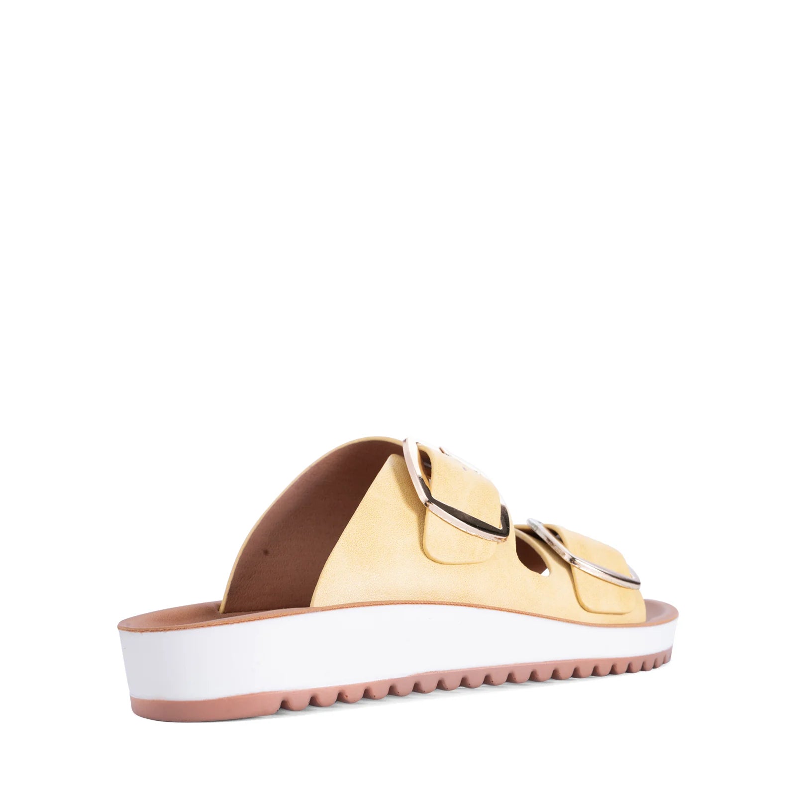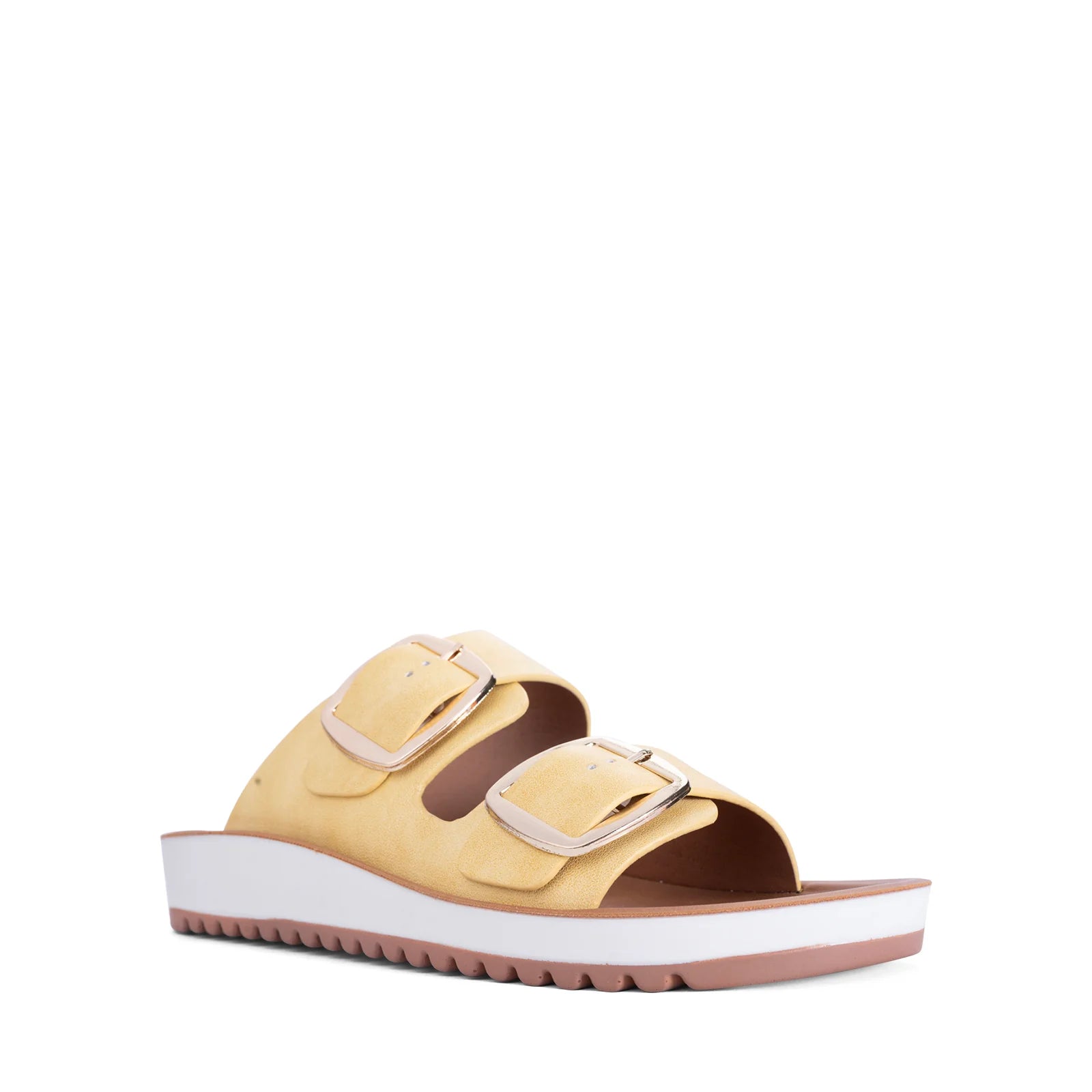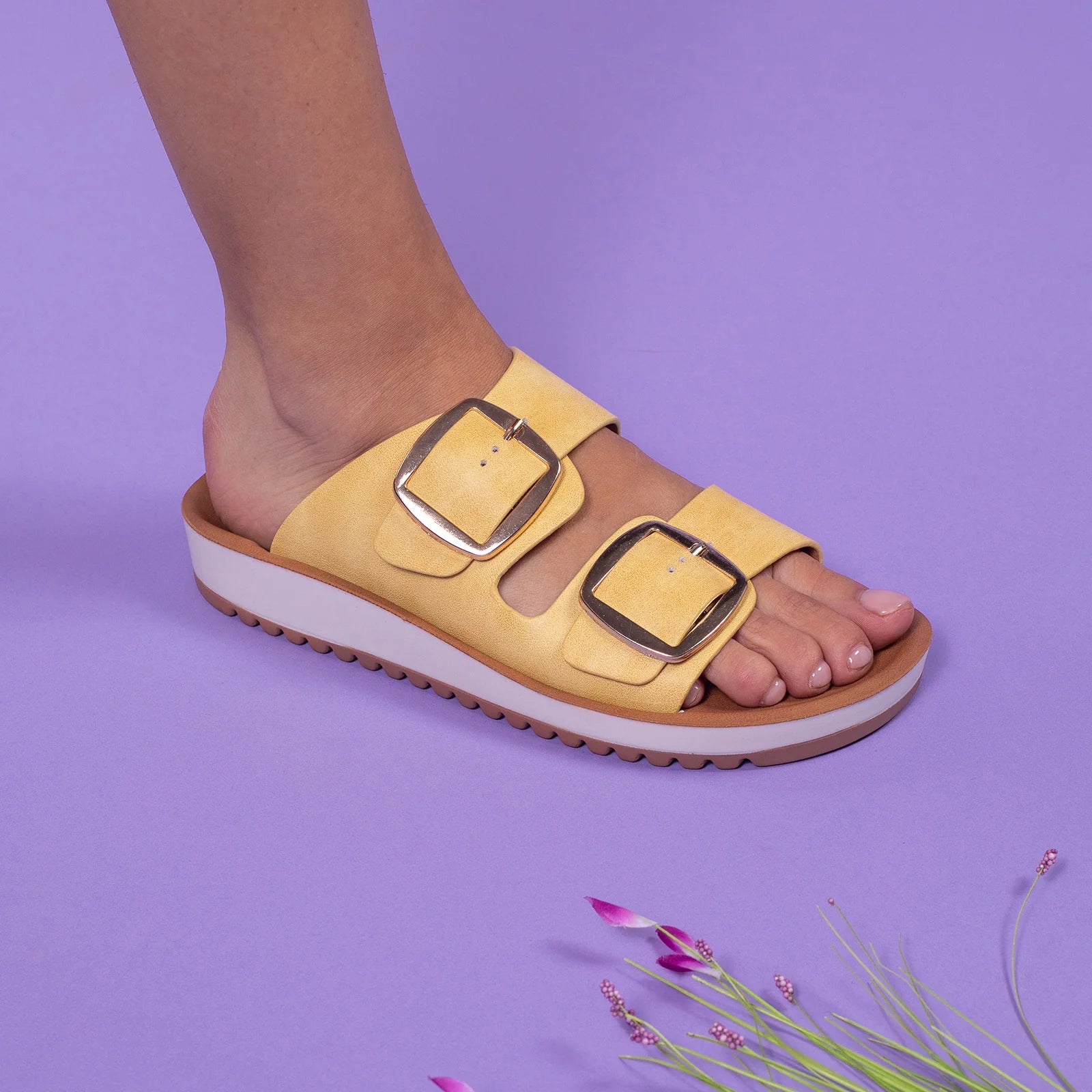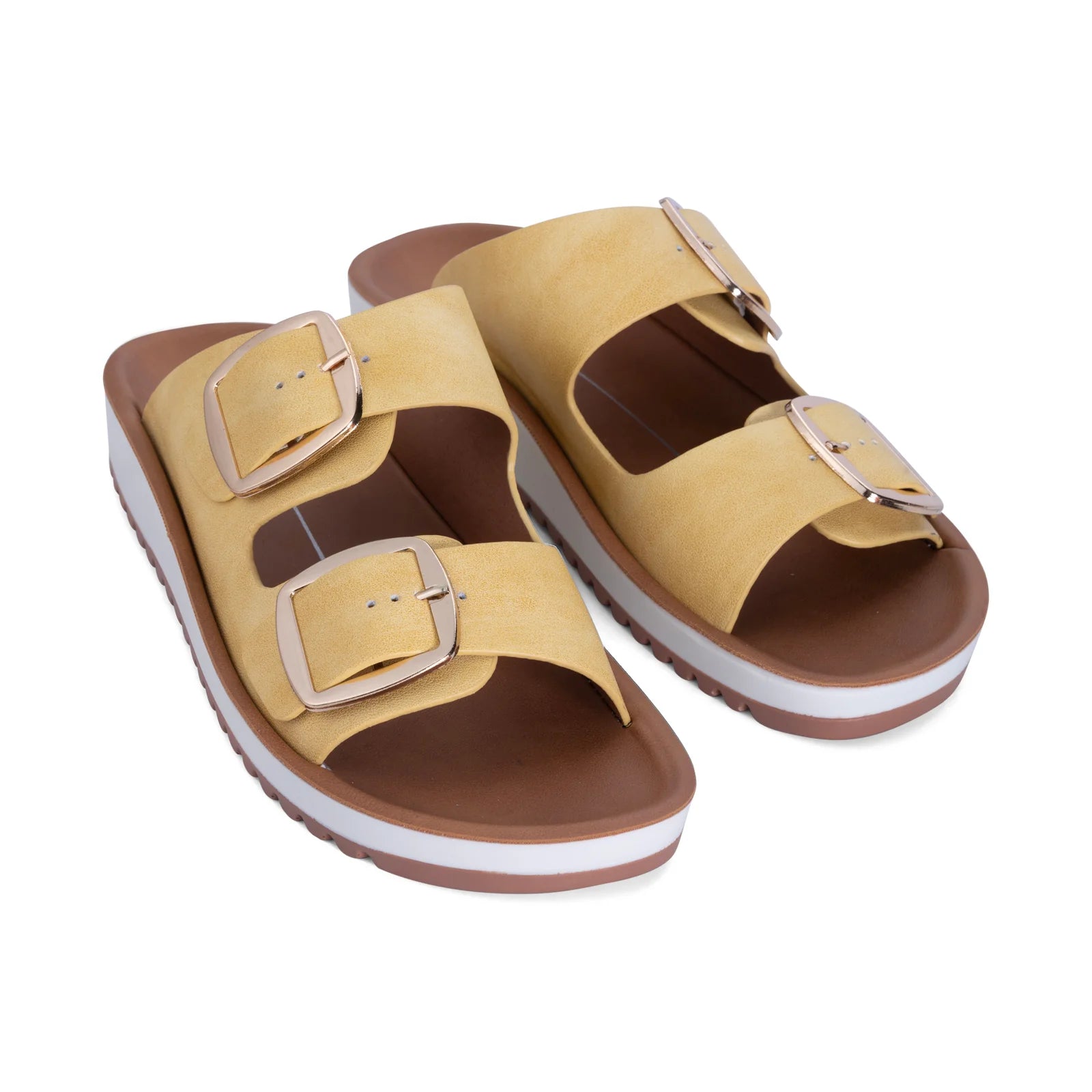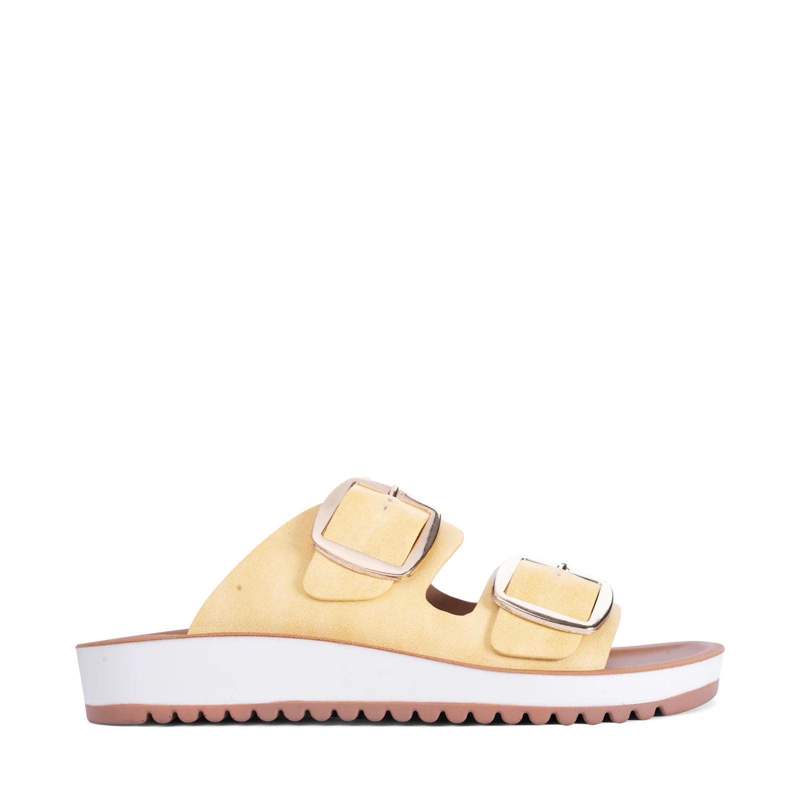Elevate your style with the Naara Sandals. These classic slides feature double adjustable buckles and a low wedge heel, combining timeless design with modern comfort. Enjoy all-day support with built-in arch support and the luxurious feel of vegan leather.