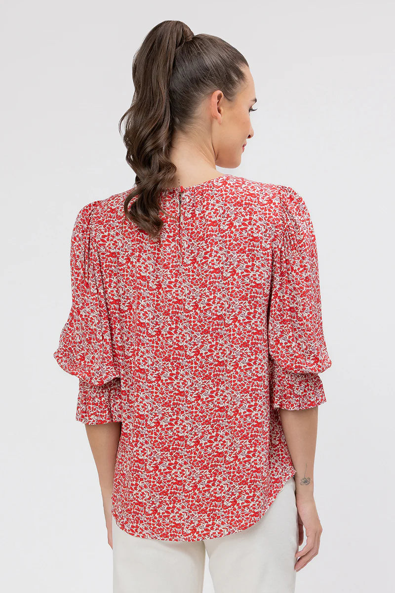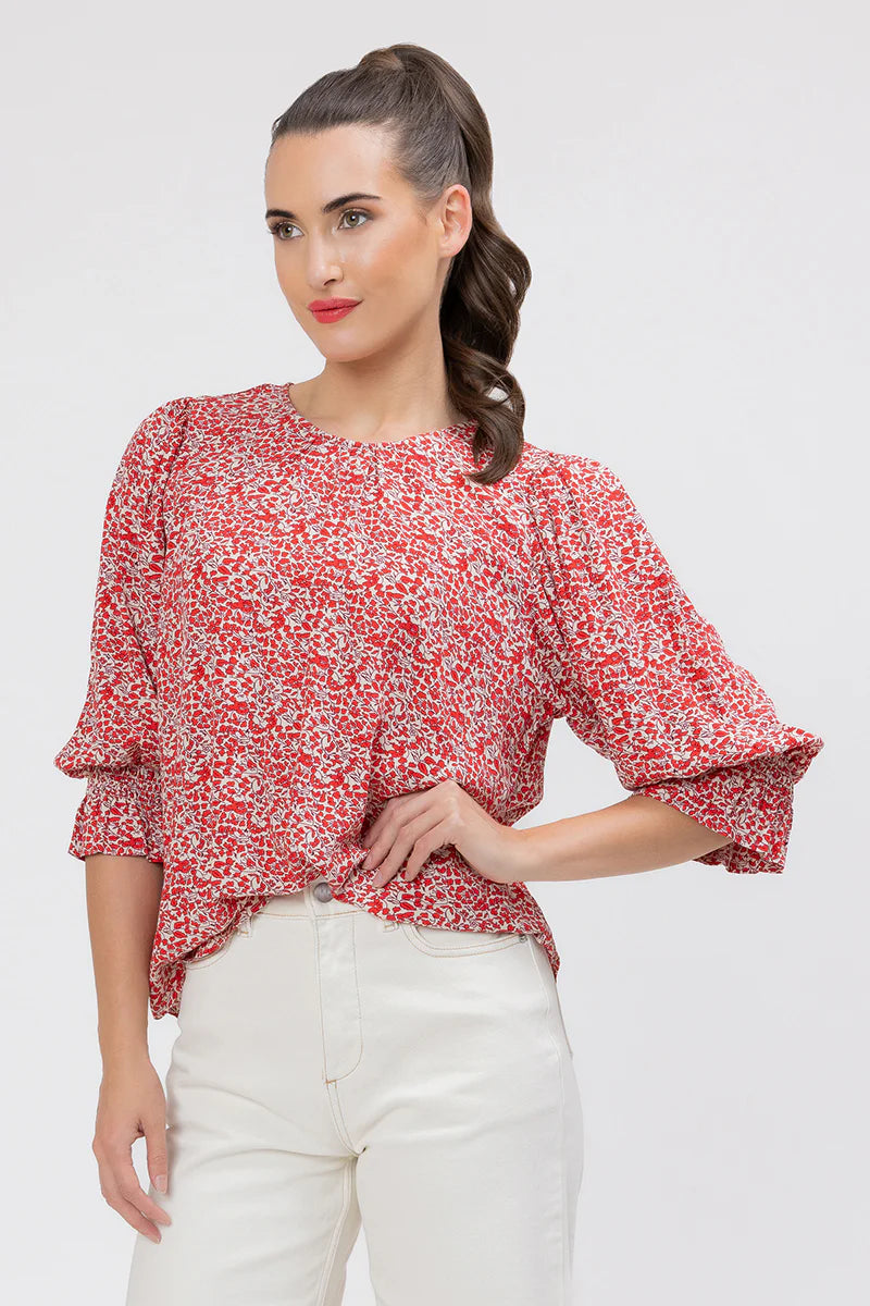 The Magnificent Top has a shirred cuff sleeve to the elbow. In a floral print of reds, white and purple, a pop of colour to brighten your outfit! Wear with jeans or a white pant!