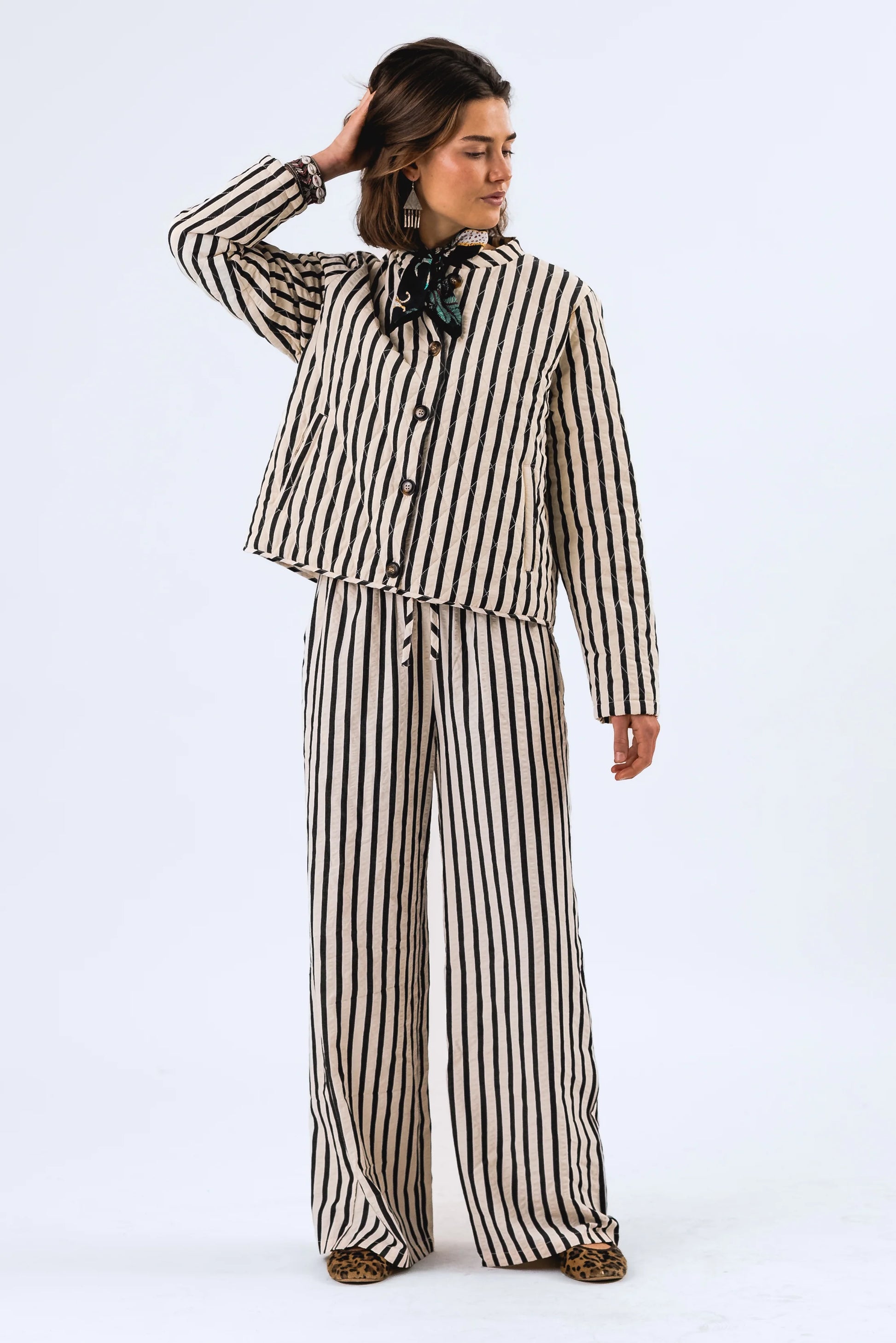The Rita pants feature classic black and white stripes. The lightweight material is perfect for creating a stylish yet relaxed look.