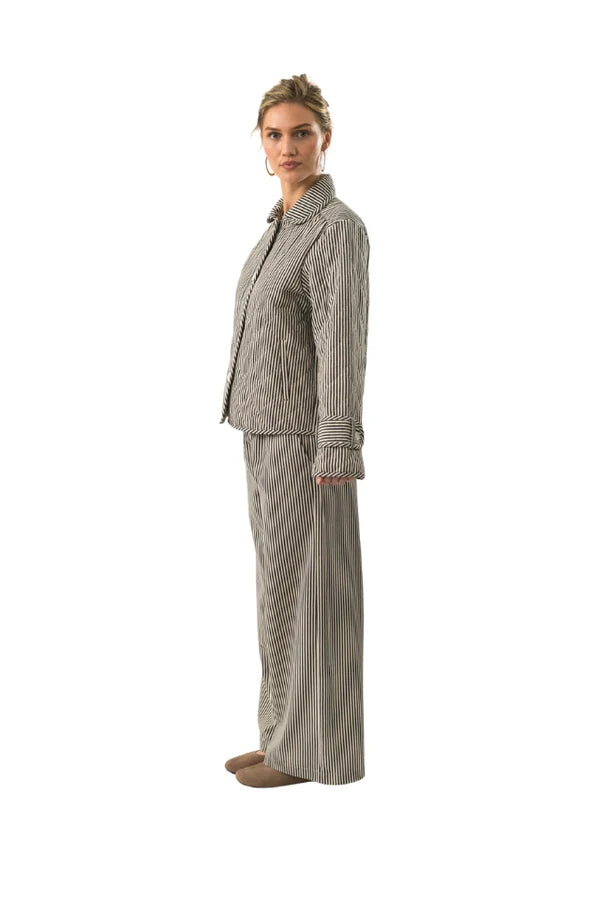 The Viola jacket is a Lollys bestseller, made from a luxurious quilted material, featuring a cream and black stripe.
