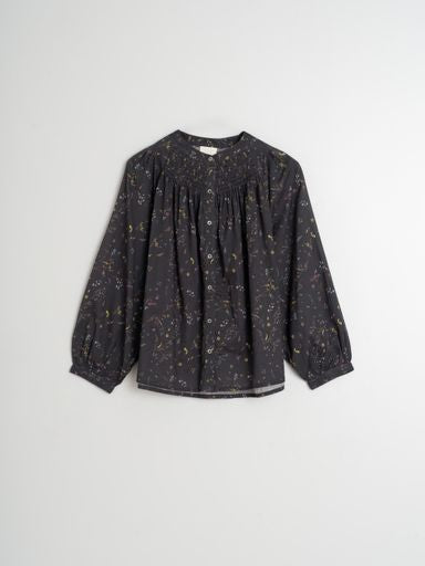 A stunning floral print on a charcoal background! This long sleeve blouse is a button through with smocking at the neck. A go to piece to wear with your favourite jeans!