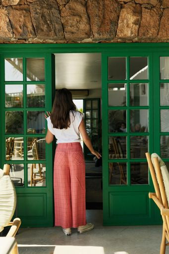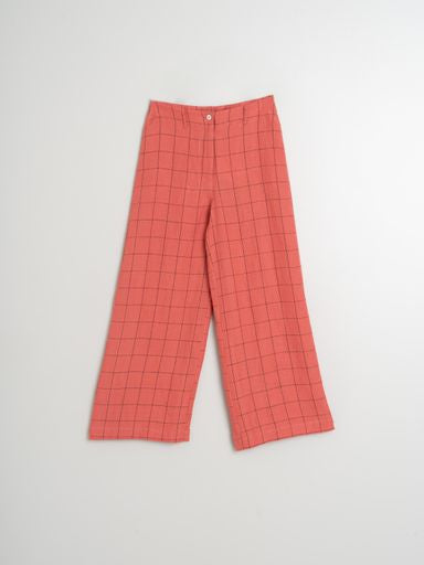 Perfect and easy to combine, it's high waisted, has a line, and is woven in cotton and linen.